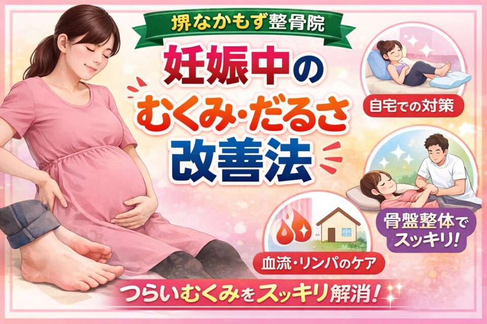 こんにちは!堺なかもず整骨院です。 妊娠中、「足がパンパンにむくむ」「体がだるくて動きにくい」と感じる方はとても多いです。 これは妊娠による体の変化が大きく関係しています。 今回は、むくみやだるさが起こる理由と、ご自宅でできるケア、整体で期待できる変化についてお伝えします。 ...